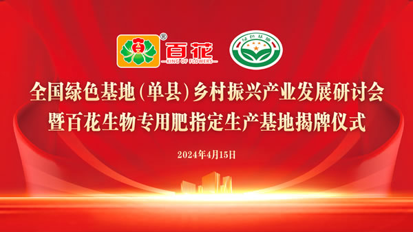 2024年4月15日,全國(guó)綠色基地(單縣)鄉(xiāng)村振興產(chǎn)業(yè)發(fā)展研討會(huì)在單縣中領(lǐng)國(guó)際酒店召開,同時(shí)為山東百花生物集團(tuán)有限公司舉行“全國(guó)綠色農(nóng)業(yè)產(chǎn)業(yè)專用肥指定生產(chǎn)基地”揭牌儀式。